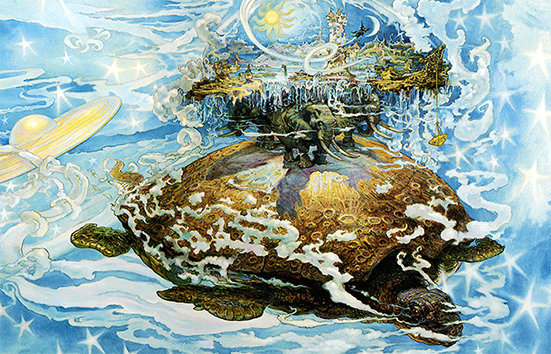 For those yet unfamiliar with Pratchett’s series of Discworld novels – of which The Colour of Magic is the inaugural entry – what you need to know is that the entirety of the land mass is flat and frisbee-shaped (and rests on the back of four giant elephants, which themselves are perched upon the back of an even larger turtle bearing them all through space, if such details are important to you). Life on the disc is somewhat shaped by the presence of magic, which tends to make the unusual become commonplace. But to a greater extent, civilization carries on much as it always has; entirely absorbed in its own self-interest.