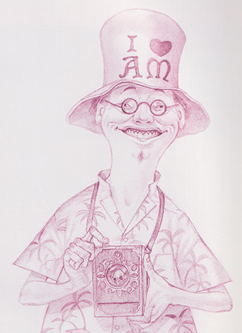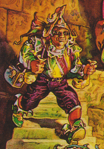 As is noted in Skep’s review, the representation of Twoflower in uncertain. On page 26 of the Corgi edition of The Colour of Magic we are told that Blind Hugh finds himself “looking up into a face with four eyes in it.” Whether Twoflower is from a race that has four eyes, or whether Twoflower merely wears glasses, is a matter of conjecture, as demonstrated by the following representations of Twoflower by Discworld artists Josh Kirby and Josh Kidby.