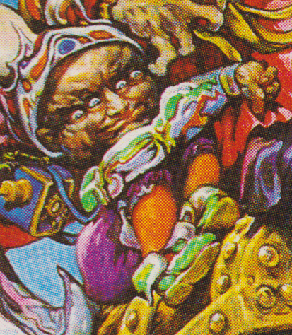 Another aspect of Pratchett’s writing I have to critique is that, for as creative and elaborate as he is in finding humorous ways to portray the mundane (like explaining how residents of the Disc build dams to harvest the sunlight as it slowly seeps across the land at dawn), reading this book is sometimes an act of mental gymnastics. Looking at Twoflower’s appearance from the perspective of other characters, he’s twice described as having “four eyes”. This is supposed to indicate to us who are familiar with the term “four-eyed” that he’s wearing glasses; but he’s a strange visitor from a foreign land in a fantasy setting, so like . . . maybe he just has four eyes? We’re on Book 1, Chapter 1 of your series here; we don’t know what kind of people there are, and you won’t make any other references to glasses elsewhere in the book to adjust our expectations accordingly. At another point in the story, Rincewind is preparing to ambush a character as he walks through a door, and he swings the sword where he thinks the neck ought to be . . . and then we’re told the sword lodges in the door frame, and then the character talks, entirely unscathed. It’s not until somewhere on the next page or so where we learn that, oh, you remember how this character is made of water? Well, he grows and shrinks like the tide, and he’s just smaller than expected today. So now we have to go back in time and revise our mental image of how the scene played out, when we could have just stated up front “turns out, his head was lower than expected” and explained why later.