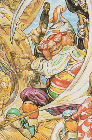 Literally, the near-entirety of Ankh-Morpork goes up in flames as a result of some light insurance fraud, and our two would-be heroes escape the fiery wreckage to go do . . . something else. I think Pratchett drops the already paper-thin plot at this point in favour of just having Rincewind and Twoflower wind up in, and subsequently escape, mildly interesting situations. However, this is a short book and we have a lot of the Disc to see, so we can’t focus on any of these places for too long or explore any nuances they might possess; meaning that the temple of unspeakable primordial evil, the big net around the edge of the Disc that catches whatever flotsam the current carries out, and the kingdom preparing to send a bathysphere into space to finally learn the gender of the World-Turtle are little more than set pieces to be discarded once the joke stops being funny. I know I praised the book earlier for bold-facedly saying “look, we agree this is all in service of an amusing bit, all right”; but if you tell me that the magic in this one location is so dense that a mountain has formed upside-down . . . the mental image of the upside-down mountain IS the joke, ha ha, we can move on. But we don’t; there’s a civilization of dragon-riders here who live in the mountain, and now we interact with them for a quarter of the book. Except the focus isn’t on exploring how life adapts to an upside-down mountain, nor does the mountain itself provide any influence unique enough to justify its continued existence in the story. So it’s . . . just a lingering joke then?
