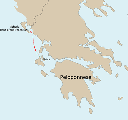 This simple map represents the last stage of Odysseus’ return home to Ithaca from Scheria after being delayed for ten years after the end of the Trojan War. Odysseus is transported by the Phaeacians while he is asleep and he wakes up confused, still unsure where he is.